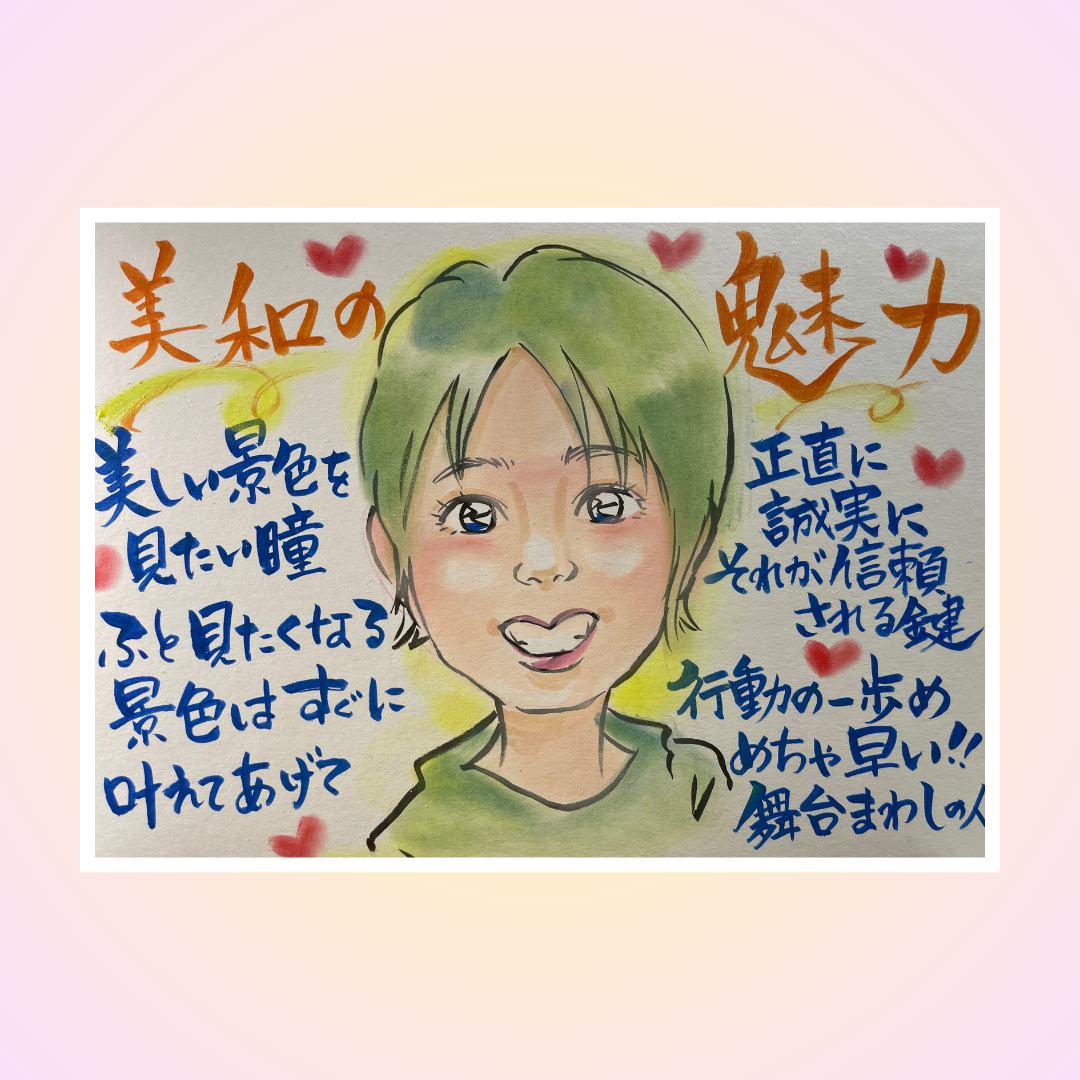 あなたの中には「夢を叶えた自分」も「叶えられなかった自分」も存在している。夢をすでに叶えた未来にチャネリングし、夢を叶うメッセージを引き出す似顔絵です。